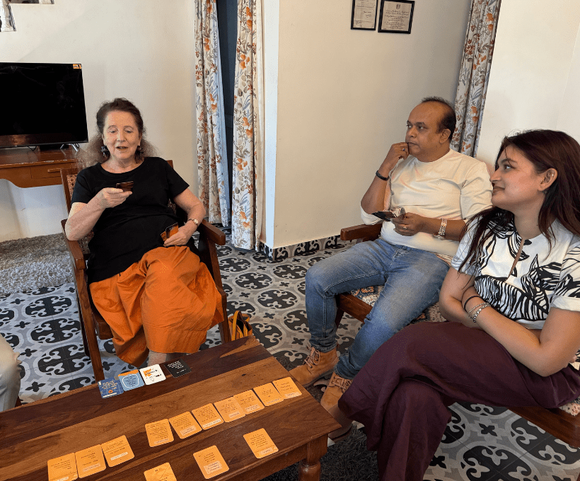 The response to the project and the game was very positive with much support for the game to be used in both schools and in tertiary contexts. Here is a picture of us playing the game around a coffee table. Of note was that Prof Nath’s 12-year-old daughter joined in on playing the game and made the comment to her father: “Can I take this to school tomorrow? I want to play it with my friends, as we want to make plans for changing the school.”